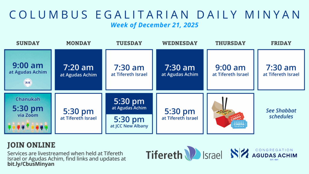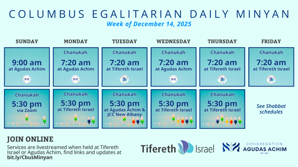 *On Tuesday evenings, Northeast Minyan is held at the same time at the JCC New Albany in the CJDS Chapel, located at 150 E Dublin Granville Rd., in addition to the service at Agudas Achim.